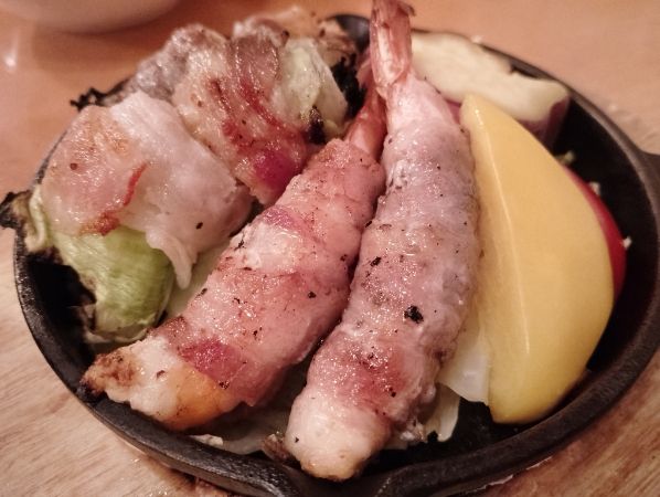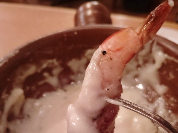 プリプリとしたエビに香ばしく炭火で焼かれたお肉が巻かれ、それをチーズフォンデュでいただく至福の時間です! レタスやエノキもシャキシャキとした瑞々しい食感も楽しめる絶品でした。