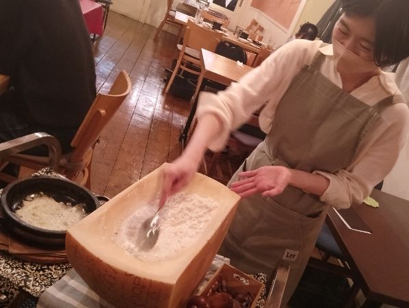 長期熟成によって生まれた深い旨みとコク、ほのかな甘みが特徴のイタリア産チーズが使われています。 『アンジェロ&ミカエル薬院』では、チーズリゾットの注文が入ると目の前でチーズリゾットを作ってくれます。何とも言えない贅沢なチーズ…これは、イタリアから直送されたパルメザンチーズ! シンプルながらもリッチな一品。さらに、仕上げには、チーズを削ってくれるので、芳醇な香りがお店いっぱいに広がります。いざ、食べてみると…アルデンテなお米の食感、一粒一粒にパルメザンチーズが香ばしく調和して、とても本格的な味でした。