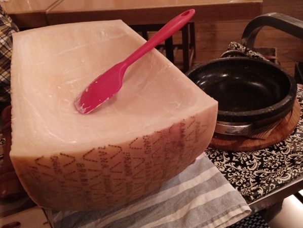 ①まず、注文すると席の近くに、ドドーン!とパルメザンチーズと調理セットが運ばれてきます。