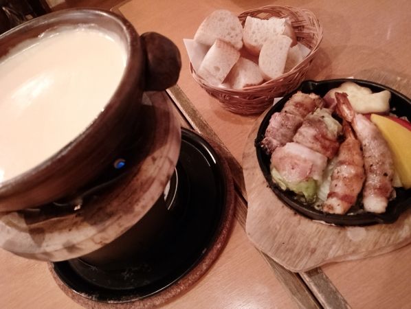 香ばしくて絶対美味しい!と思わせるジューシーに焼けている香りがお店の中だけでなく、換気口を通してお店の外でも感じさせてくれます。チーズフォンデュの具材として、エビ・レタス・エノキにはお肉が巻いてあります。野菜も付いています。お肉の旨味が合わさった『アンジェロ&ミカエル薬院』でしか、『アンジェロ&ミカエル薬院』だから味わえるチーズにバケットの追加注文は、ぜひともオススメです。次々とIN!するごとに楽しいチーズフォンデュタイムは、最高のひとときです♪