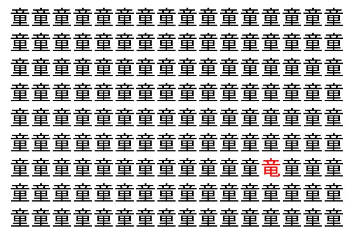 画像の中には、「童」という漢字が縦に9行、横に16個並んでいます。 全部で144個となりますが・・・、そのうち1つは「異なる漢字」となってますよ!!