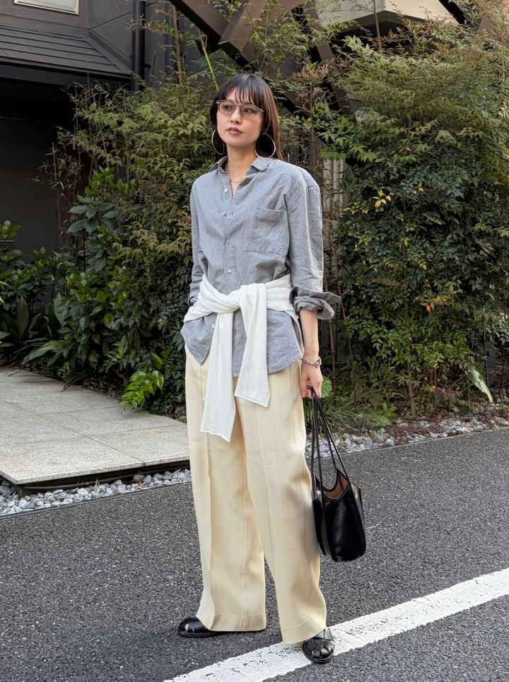 「ライトグレーのシャツにアイボリーのパンツを合わせて全体を淡いトーンでまとめました。ベルト代わりにニットを腰でキュッと巻いて、コーデにメリハリをプラス。ベルトやジャケットではなくニットを選ぶことで、程よいヌケ感とリラックスしたムードが加わります。淡いトーンで全体がぼやけないよう、小物はシルバーやブラックで引き締めてバランスを調整しています」