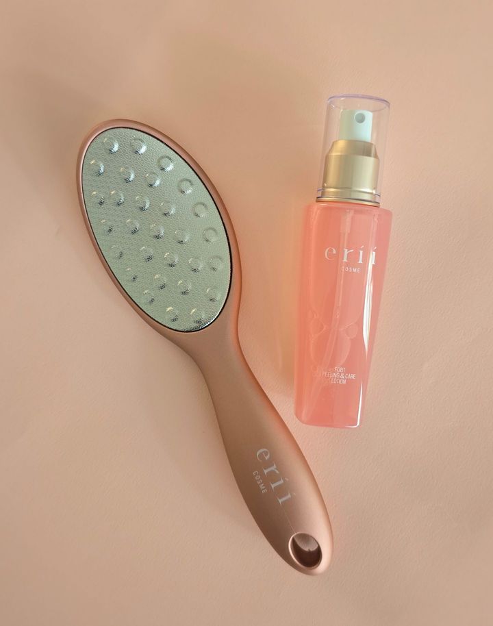 皆さま、かかと、大丈夫? まるで消しゴムカスがぼろぼろと落ちるように簡単、時短で角質をオフできます。まずは、「エリィ フットケアローション」を足裏にスプレーしてなじませたら「エリィ かかと削り ドッティ」の粗め面で硬くなった角質を削り、細かめの面でなめらかに整えるだけ。ふやかし不要で潤いを与えながら足裏の角質ケアが叶います。