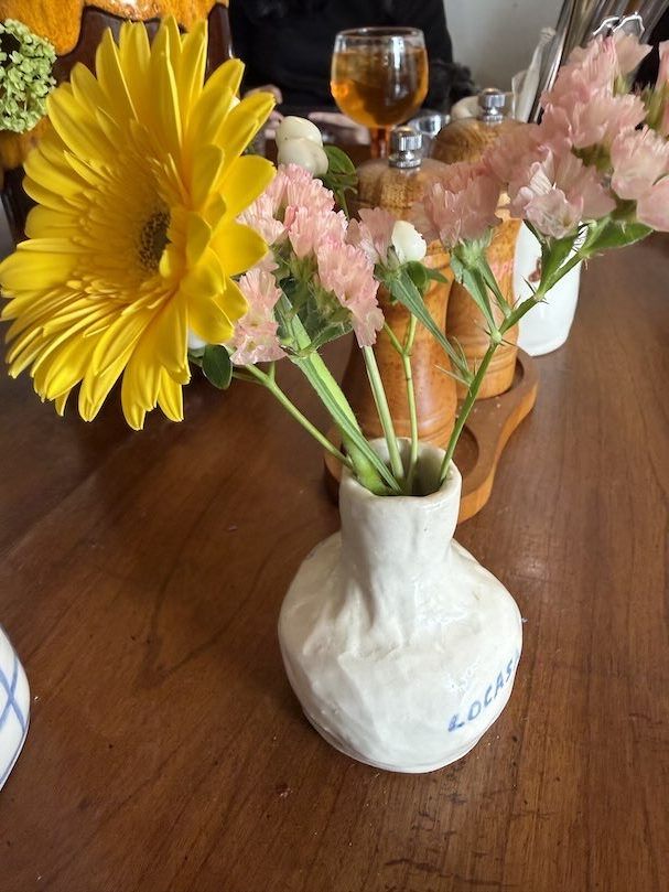 店内はカウンター席、大きなテーブル席、テラス席、椅子と1人分のテーブルの席と用意されています。とっても素敵なんです。テーブルの中央には素敵なお花が。ダリアが印象的でした。