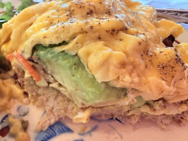 ふわっふわのオムレツの下にはパンの上にアボガドがぎっしり。