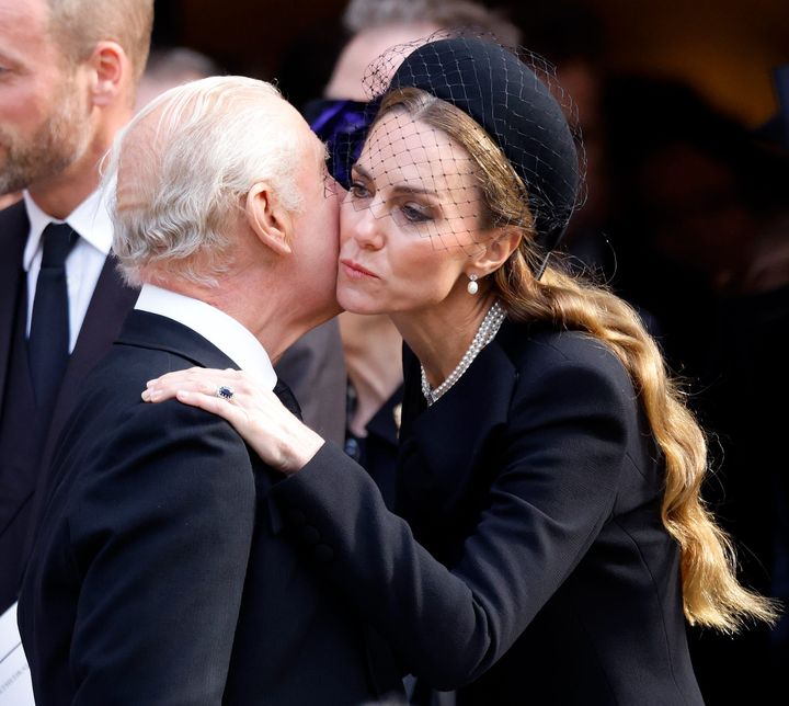 2025年9月にロンドンのウェストミンスター大聖堂で行われたケント公爵夫人キャサリン妃(エリザベス女王のいとこ、エドワード王子の妻)の葬儀では、出席したロイヤルファミリーが運ばれていく棺を見送った後、その場を離れる前にチャールズ国王に挨拶するキャサリン皇太子妃の姿が写真に捉えられました。