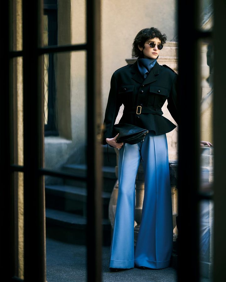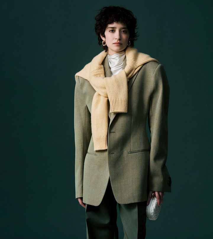 オーバーサイズのジャケットにペールイエローのニットを肩掛け。抑制された色調の中でジャケットのパワーショルダーやシェイプされたウエストが際立ちます。伝統的なテーラリングを踏まえながらも力強いフォルムがモダンなムードを演出。