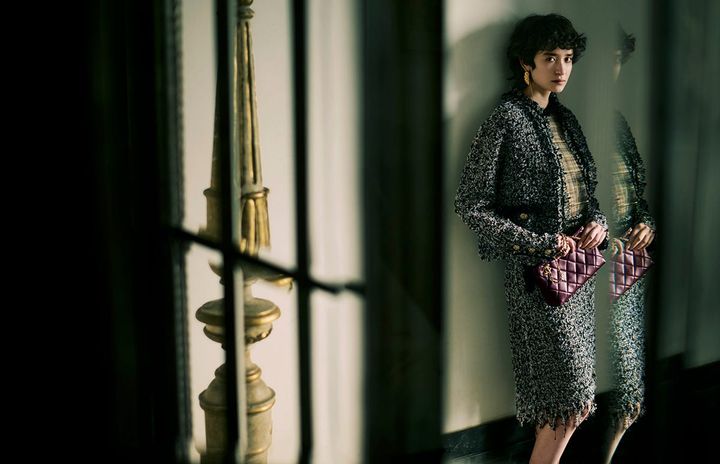 ツイードのセットアップのように見えて、実はしなやかなニットで構築されたジャケットとスカート。ガブリエル・シャネルが愛した、メゾンを代表する象徴的なコードであるツイードが新たなテクスチャーで描き換えられました。遊び心を感じられる揺れる裾のフリンジが、クラシックをしなやかに更新します。