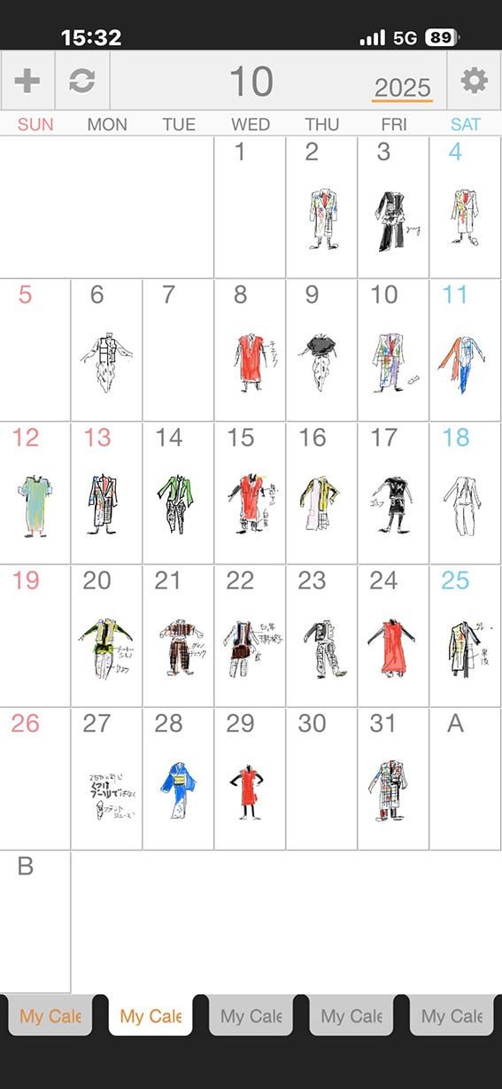 コシノのスマートフォンに表示された毎日のコーディネートのカレンダー。 Hearst Owned