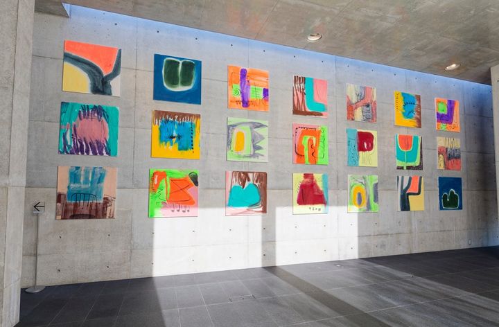 WORK#2550他《3COLORS 》(2024)、各 72.8×72.8㎝、通称「スクエア」シリーズは3色限定で描かれる絵画 で、「少なさ」によって「豊かさ」を引き出す試みだ。素材は、アクリル絵具、木炭、パステル/シーチング。KHギャラリー芦屋(旧小篠邸)で展示風景より。 Hearst Owned