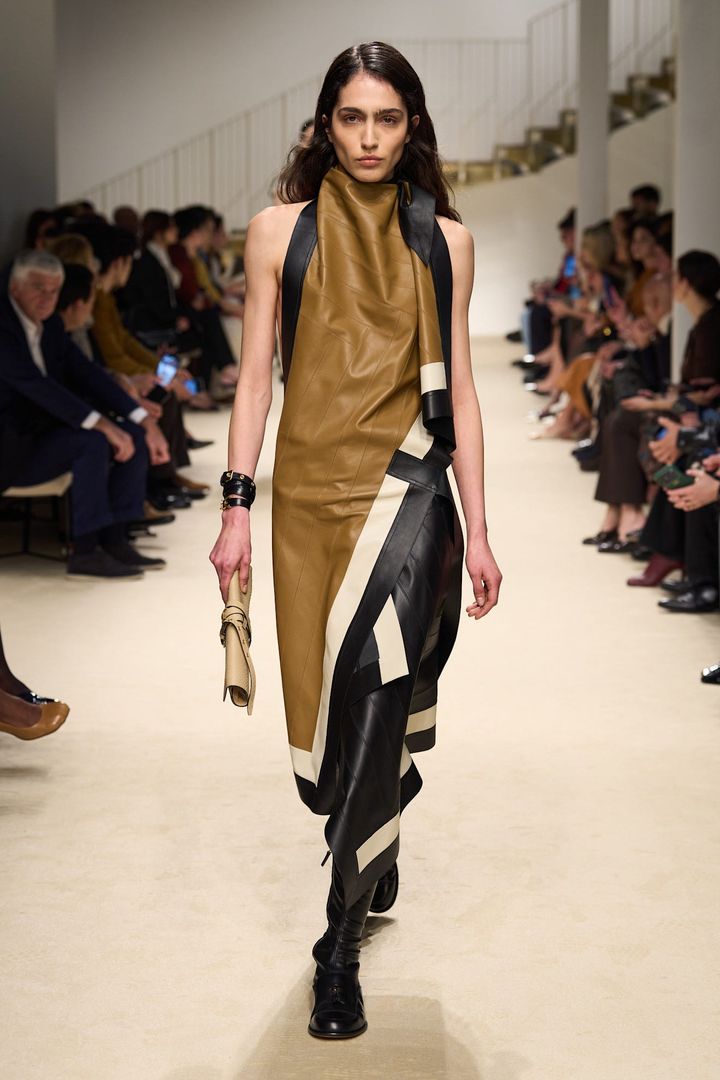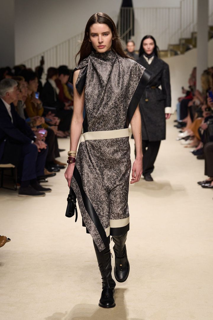 特に注目されたのは、ブランドが“パシュミー”と命名したシルクのように軽くしなやかなレザー。アウターやスカート、パンツに用いられ、その柔らかさと奥行きのある色彩が、「トッズ」のクラフツマンシップを雄弁に物語る。また、写真家・森山大道の雪景色や、アーティスト、スターリング・ルビーに着想を得たグラフィカルなプリントやパッチワークドレスなど、視覚的なレイヤーも印象的だ。ウォッシュやシワ加工が施されたレザーには、使い込まれたような風合いが加えられ、時間の経過すらデザインに取り込む姿勢が見て取れる。