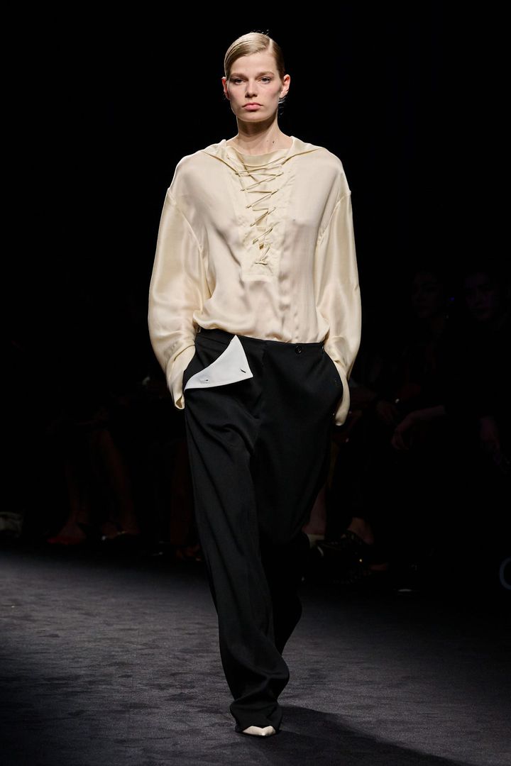 コレクションは、包み込むようで厳格なシルエットが特徴的だ。ローブのようなコートや禁欲的なチュニック、金属のリベットを配したブーツなどに中世の空気が漂い、構築的なフォルムと研ぎ澄まされたデザインが全体を貫く。一方で、サテンのロングドレスや柔らかな素材が加わることで、静ひつさの中にさりげない官能性が差し込まれた。