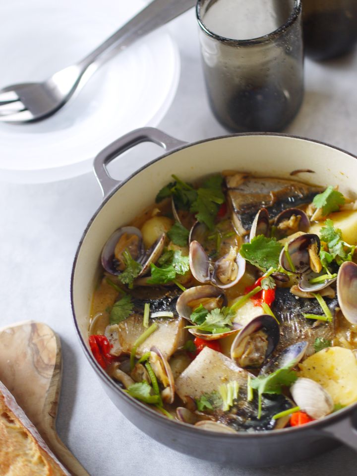 焼き魚のイメージが強い塩さばを、あさりやトマト、じゃがいもとともに煮てアクアパッツァに。仕上げにたっぷりのパクチーを加えて、ポルトガル風にアレンジ! ごろっと具だくさんの一品は、パンはもちろんご飯にも合う。