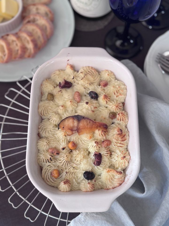 塩さばと、ミックスビーンズ、玉ねぎと混ぜた具材の上にマッシュポテトを星口金で絞り飾れば、一気におもてなし感ある変化球アッシュ・パルマンティエに。マッシュポテトに入れたわさびが、さばの風味もマイルドになり、ほんのりピリ辛でお酒が進む!