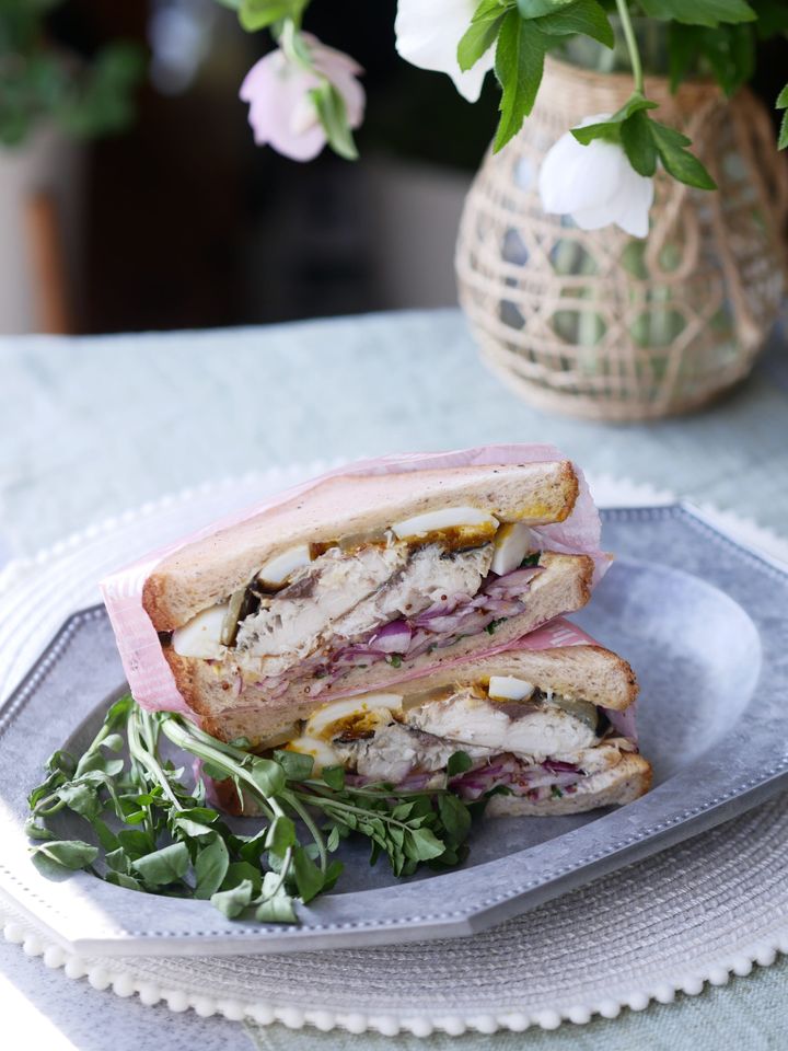 塩さばのうま味とクレソンのほろ苦さ、玉ねぎのピリッとした辛み、ピクルスとマスタードの甘酸っぱさなどを重ねたサンドイッチ。あたたかい季節には、ロゼワインに合わせて大人のおつまみにどうぞ。