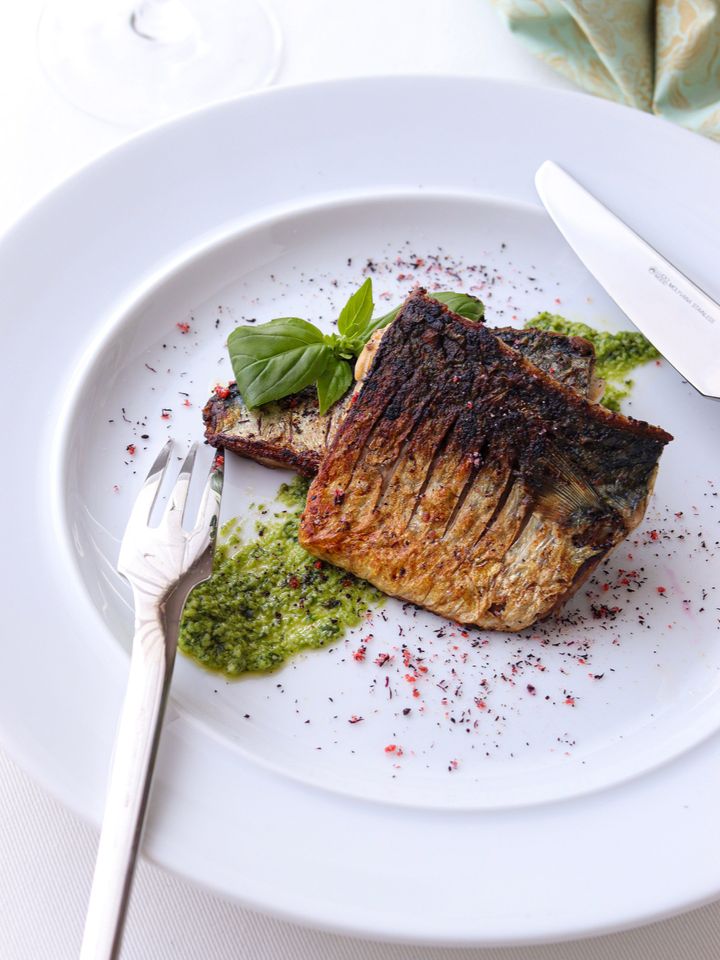 塩焼きや煮付けに飽きたらおすすめなのが、洋風仕立てのパン粉焼き。たっぷりのパセリとチーズ、にんにくの香りが食欲をそそる。キリっと冷えた白ワインと合わせても美味。
