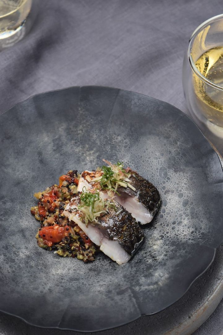 キヌアにしょうがとみょうが、大葉の薬味を合わせた、香り豊かなサラダ。炙ったしめさばの香ばしさとキヌアの食感、薬味の爽やかさが調和する。白ワインや日本酒とともに楽しんで。