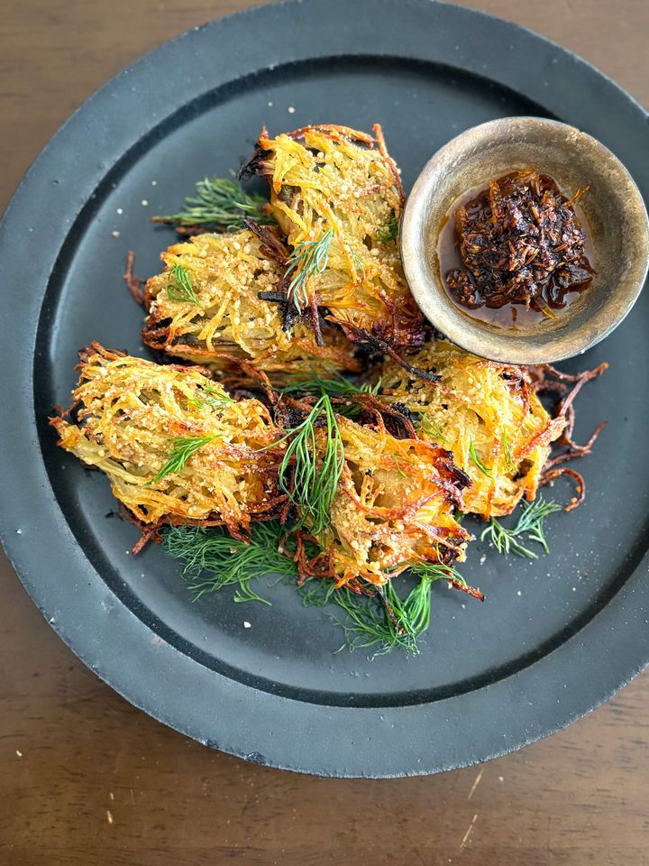 塩さばに柚子茶とじゃがいもをまとわせ、オーブンでカリッと香ばしく焼き上げて。柚子茶の香りがさば特有の風味を軽やかに引き立てる。スパイシーなたれを絡めて味わえば、後を引くおいしさが生まれる。