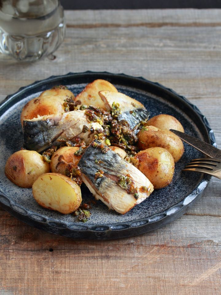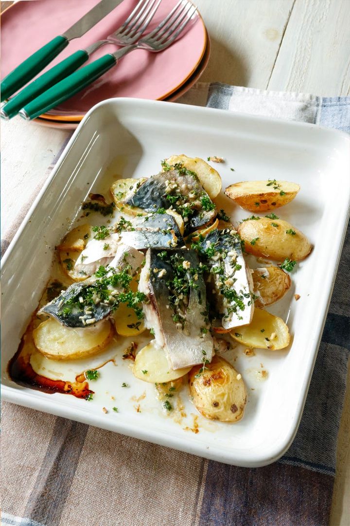 さばににんにくとハーブをまぶしてローストすることで、爽やかな香りが臭みを和らげる。ローストしたじゃがいもとともに、レモンとバターの風味が食欲をそそる一皿に。