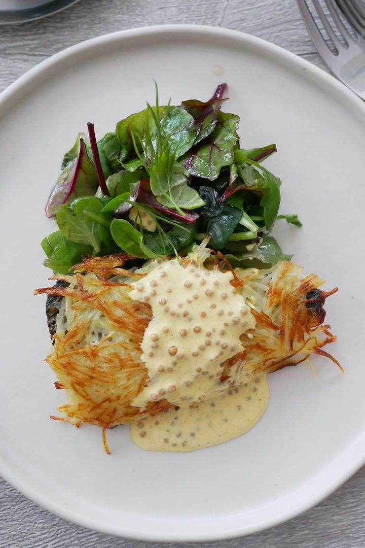 塩さばとポテトガレットを組み合わせた一皿。しっとりとしたさばとカリッとしたガレットの食感が楽しい。カレーとマスタードの個性的なソースがさばのクセを和らげてくれる。小さく仕立てておつまみにも、おしゃれなディナーのメインにも活躍する。