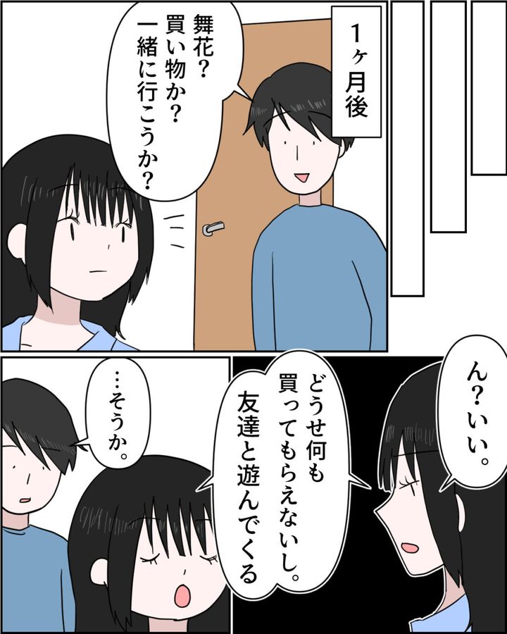 それから1ヶ月後。謙介は今も実家で肩身の狭い暮らしをしています。外出しようとする舞花ちゃんに「買い物か?一緒に行こうか?」と声をかけるも、彼女は冷たい表情で「いい、どうせ何も買ってもらえないし友達と遊んでくる」と即答。謙介を気にも留めず、そのまま出て行ってしまいました。