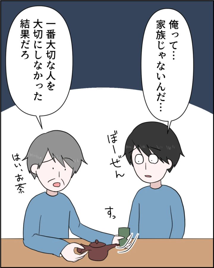 電話を切られた謙介は、「俺って、家族じゃないんだ・・・」と呆然と立ち尽くしました。そんな謙介に、義父は静かにお茶を差し出し、「一番大切な人を大切にしなった結果だろ」と言ったのでした。