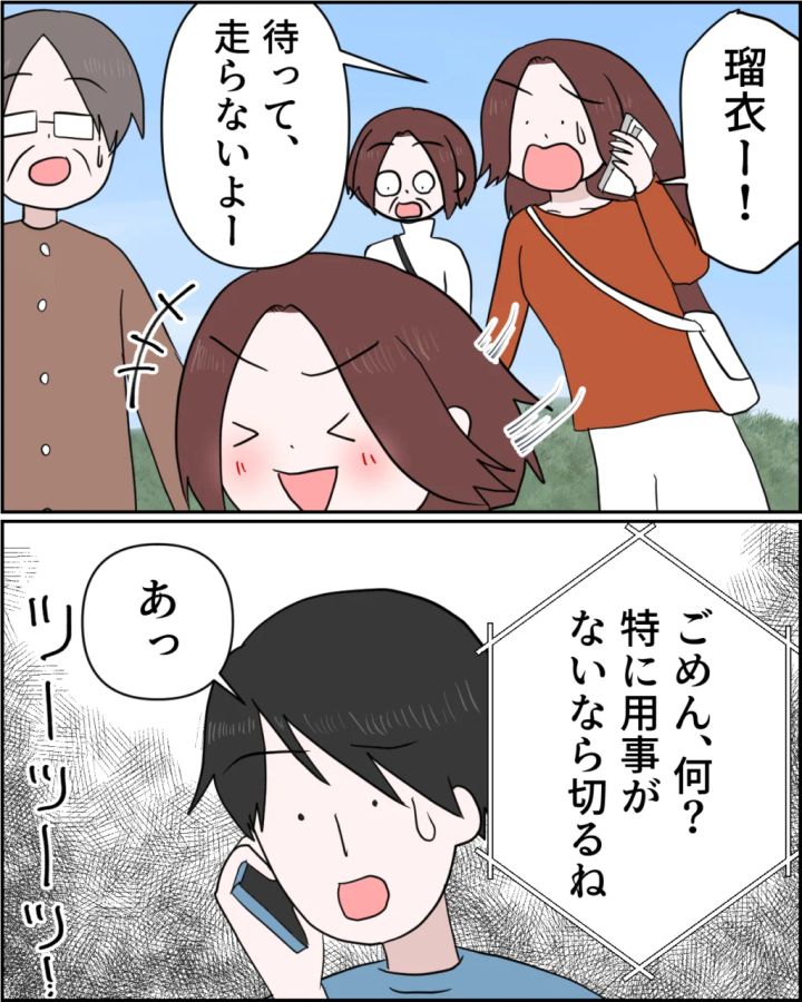 その瞬間、瑠衣が勢いよく走り出してしまいました。私は瑠衣を追いかけようと、「ごめん、何?特に用事がないなら切るね」とだけ言って、謙介との通話を切りました。
