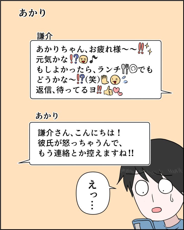 舞花ちゃんに断られた謙介は、それならばとあかりちゃんに声をかけます。「あかりちゃんお疲れ様~!もしよかったらランチでもどうかな~!?返信待ってるヨ!」相変わらずのおじさん構文は健在です。ところが返ってきたのは、「彼氏が怒っちゃうんで、もう連絡とか控えますね」という一文だけ。遠回しに『もう連絡してこないでほしい』と告げられた謙介は、画面を見つめたまま悲しそうに「えっ・・・」とつぶやきました。