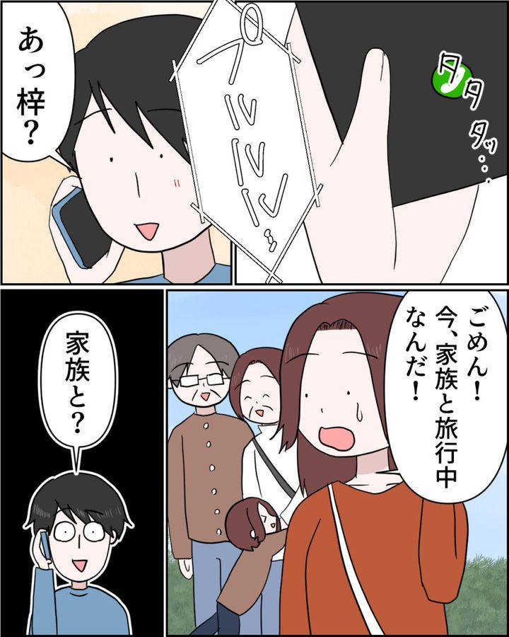 舞花ちゃんにも、あかりちゃんにも相手にされなかった謙介は、最後の頼みとばかりに私へ連絡してきました。私が電話に出ると、謙介は「あっ、梓?」と、どこか嬉しそう。しかし、ちょうど家族水入らずで旅行を楽しんでいた私は、謙介に構っている暇などありませんでした。