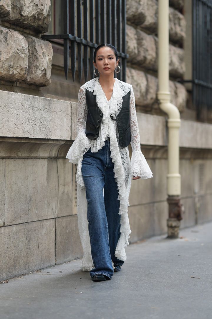 シンガポール出身のインフルエンサー、ヨーヨーは、流れ落ちるようなレースのロングカーディガンとブルーデニムをコーディネート。さらに「クロムハーツ」のレザーベストを重ねるという上級者テクを披露。相反する素材のコントラストで、エッジの効いたモードなボーホーシックを完成させた。