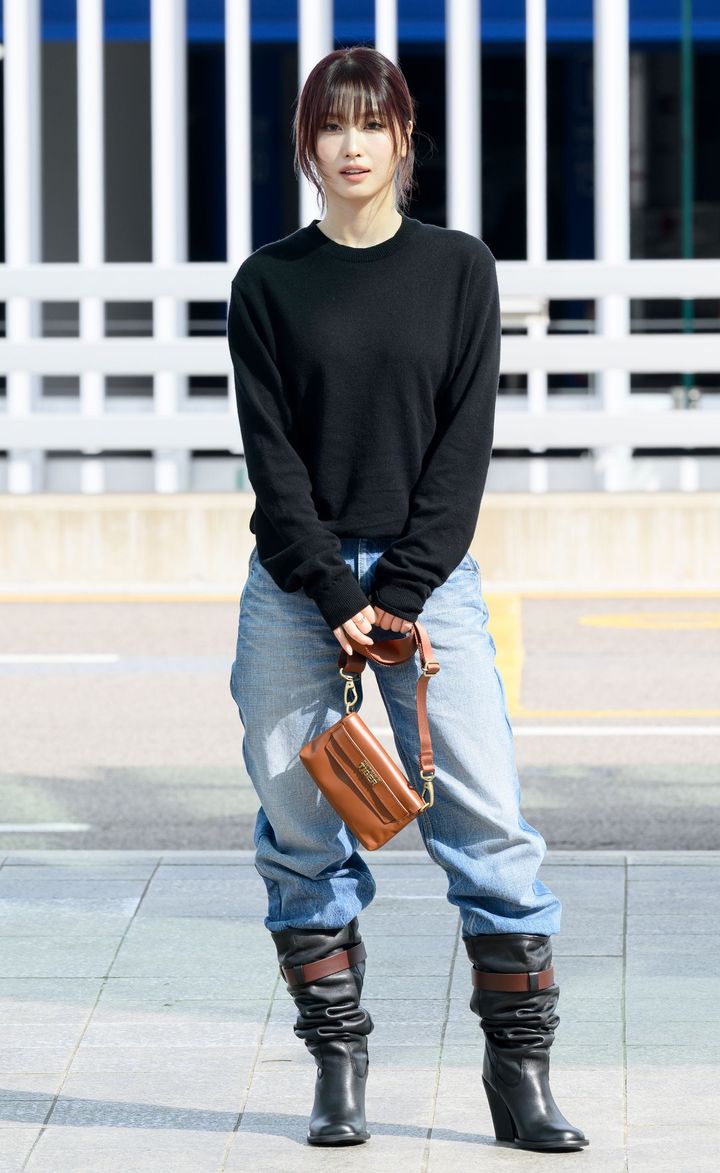 空港でキャッチされたモモは、少し太めのデニムを「オニツカタイガー」のブーツに無造作にイン。スキニーデニムをブーツインしたスタイリングとはひと味違う、ダボッと感が新鮮! トップスは黒スウェットのみと潔くシンプルに徹することで、モダンな印象もキープしている。