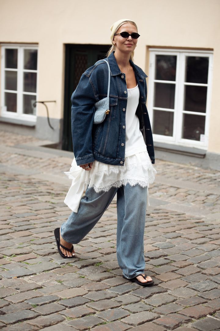 デニム・オン・デニムにトレンド感たっぷりのレーススカートをプラスしたのは、インフルエンサーのホリー。Gジャンにはインディゴデニムを、パンツにはライトブルーデニムを選び、コーデにリズム感を生んだのもグッドアイデア! 軽やかなビーチサンダルで、抜け感の演出もばっちり。