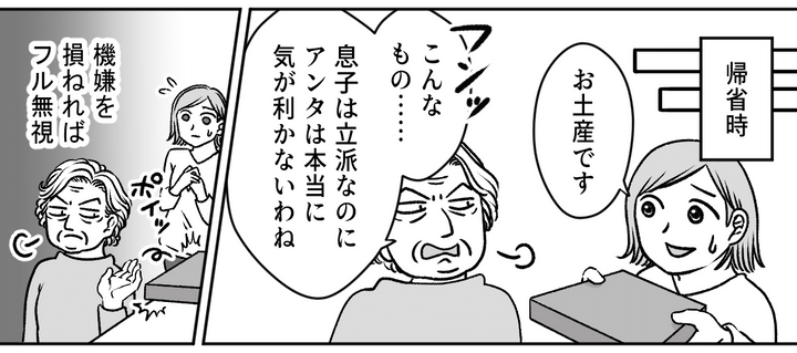 お土産を持っていけば「こんなもの……」と言われるし、旦那のことは褒めて持ち上げ、私を下げるのも当たり前。帰省中も機嫌を損ねればフル無視。謝ってもフル無視。孫のことまで無視する始末。自分の思い通りにならないと、急に存在ごと消されたように扱われます。