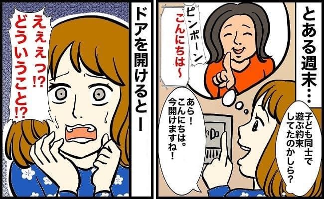 子どもが遊ぶ約束してたかな?と思い玄関を開けると……。立っていたのはママ友だけではなかったのです――。