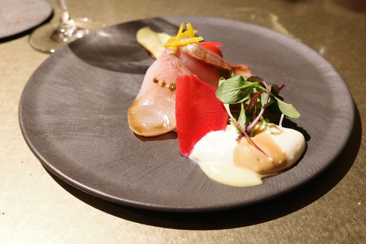 「津本式」で仕立てた宮崎産のブリ。適度に熟成され、旨味が凝縮した身の柔らかさは圧巻。豆腐のムース、自家製ネギマヨネーズ、大根のピクルス。柚子の香りがレイヤーとなり、ブリの脂の甘みを美しく際立たせる。