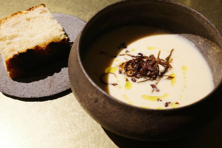 トッピングされたカカオニブのカリッとした食感と、仕上げのオリーブオイル。このふたつのアクセントが、野菜のスープをまるで奥行きのある上質なデザートのような、驚きの味わいへと変化させている。