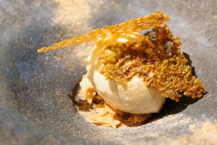最初の一皿は、春の息吹を感じさせる「ふきのとうのアイス」。パセリのチュイルとふきのとうパウダーを纏ったタルト生地が、アイスの冷たさと溶けあう。野性味のあるほろ苦さを優しい甘みが包み込み、食欲を一気に呼び覚ます「目覚め」の一品だ。