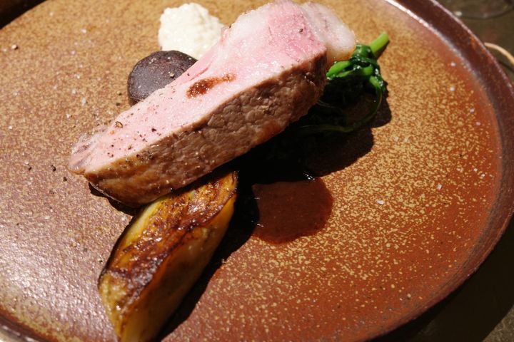 メインは、湘南のブランド豚「みやじ豚」の肩ロース。丁寧な火入れにより、ピンク色の断面からは肉汁が溢れ出す。赤ワインとチョコレートを合わせたソースは、チョコのコクが豚の脂の甘みと共鳴し、五感を満たす濃厚な味わいへと誘う。