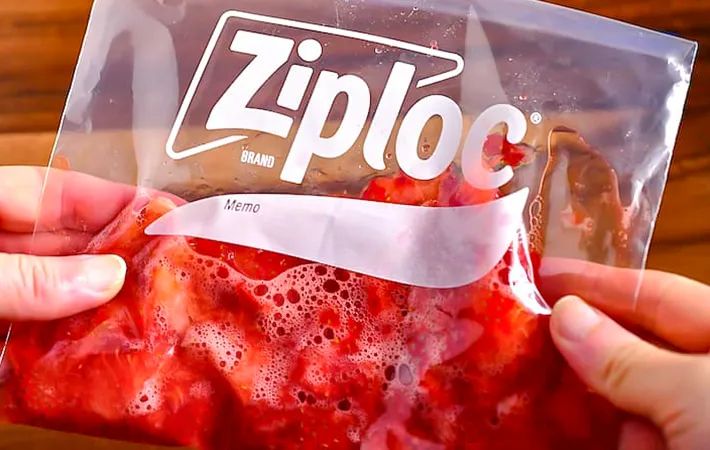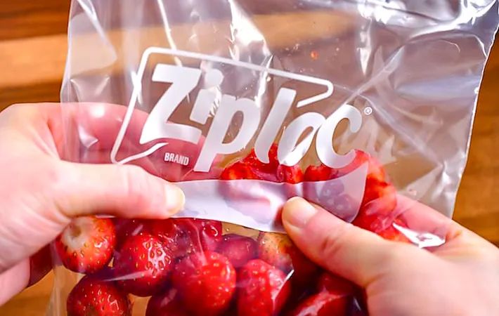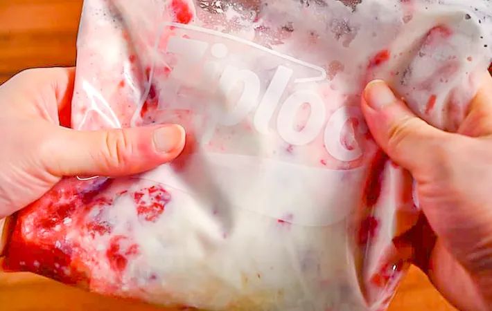 ジッパー袋に『1』のイチゴを入れ、しっかり閉めてから手で揉んで潰します。