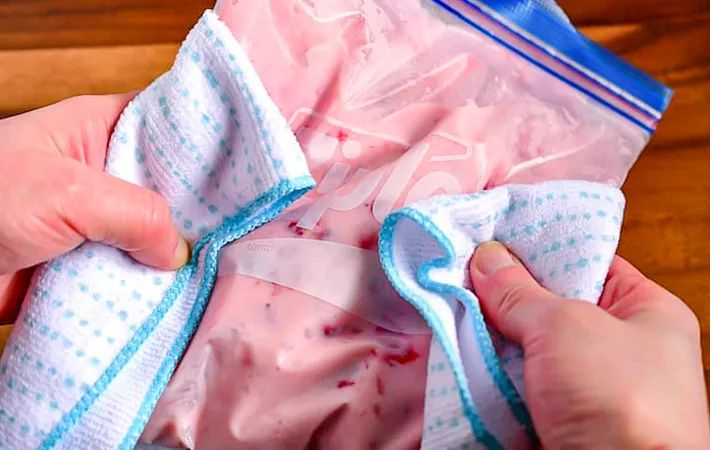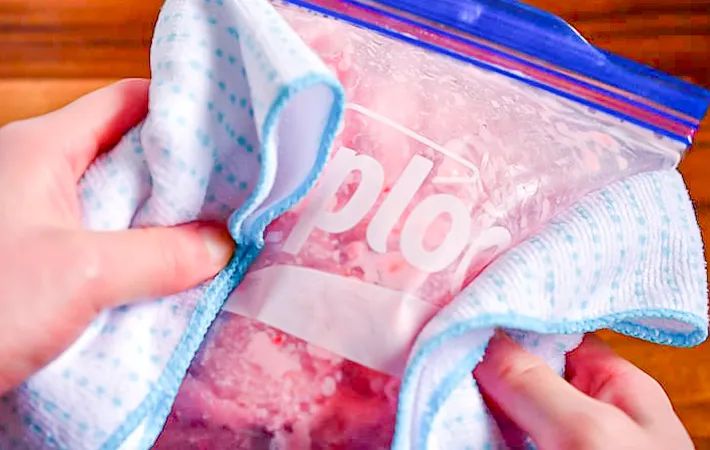 1時間ほどして少し固まってきたら、冷凍庫から出して、手で揉んで全体を混ぜます。冷たいので、タオルなどを使うといいです。