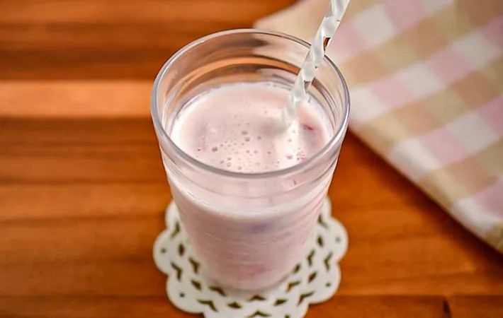 グラスに『イチゴヨーグルトアイス』100gと牛乳100㎖、レモン汁小さじ1杯を入れて混ぜれば、おいしいドリンクのでき上がりです。