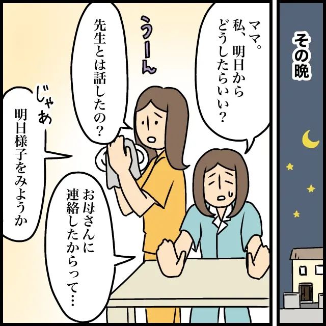 その晩。明日も同じようになったらどうしようと心配になった班長さんは「ママ。私、明日からどうしたらいい?」とお母さんに相談。的確なアドバイスがすぐに浮かばなかったお母さんは「うーん・・先生とは話したの?」と聞くと、先生から女の子のお母さんに連絡をしたということだったので「じゃあ、明日様子をみようか」とひとまず様子をみることに。