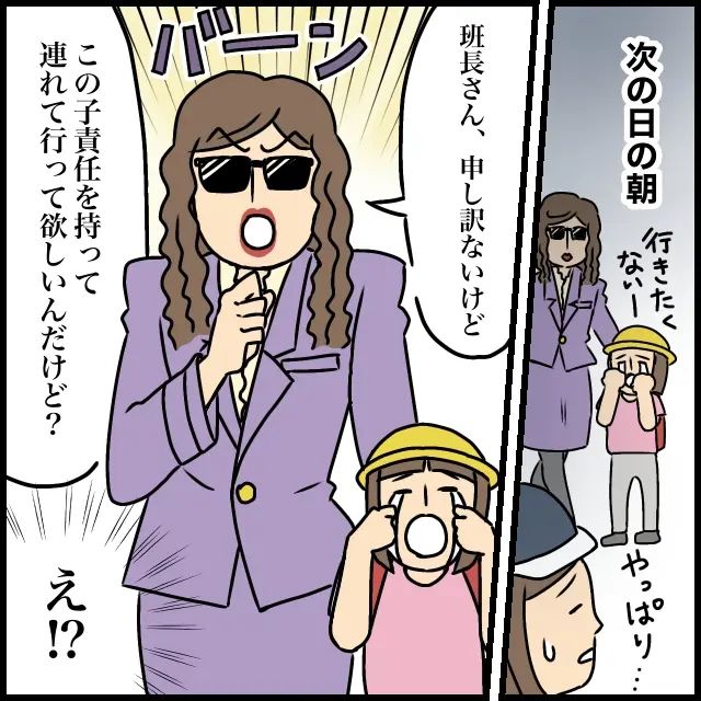 次の日の朝。お母さんに付き添われて集合場所にやってきた女の子は、すでに「行きたくないー」と泣いていました。状況は昨日よりも悪くなっています。「やっぱり・・」と班長さんが重い気持ちでいると、女の子のお母さんが泣いている女の子の背中を押しながら近づいてきて「班長さん、申し訳ないけど、この子責任を持って連れて行って欲しいんだけど?」とさらり。お母さんが何とかしてくれるかもしれないと期待していた班長さんは「え!?」と驚きます。