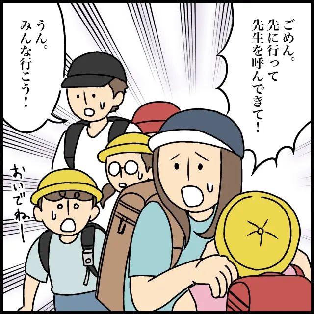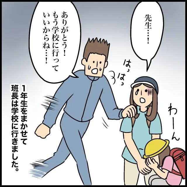 先生の到着にホッとした班長さんは「先生・・!」と思わず涙ぐみます。走って駆け付けてくれた先生は、息を切らしながら「ありがとう!もう学校に行っていいからね・・!」と言ってくれ、班長さんは1年生を先生に任せて急いで学校に向かいました。