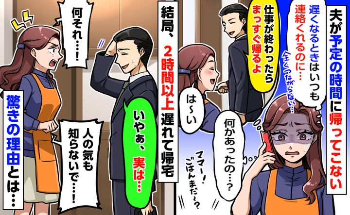 夫「仕事終わったらまっすぐ帰る」連絡がつかないまま2時間経過「いやぁ実はさ」心配で泣く私に明かした理由