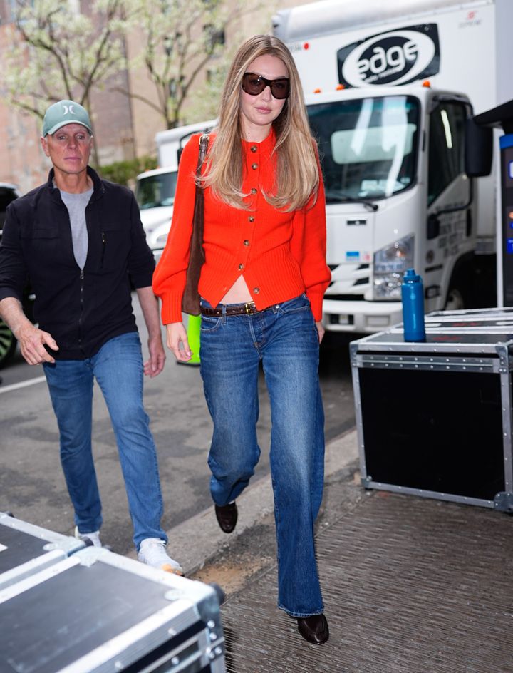 ジジ・ハディッドもスマート・ジーンズを愛用中。自身のブランドであるゲスト・イン・レジデンス(GUEST IN RESIDENCE)の赤いカシミアカーディガンに、ザ・ロウのローファーをコーディネートし、春の不安定な気候に最適なルックに仕上げた。