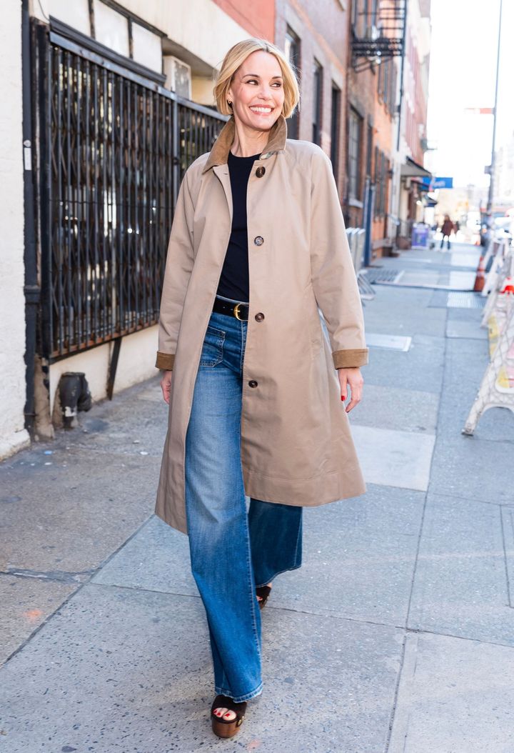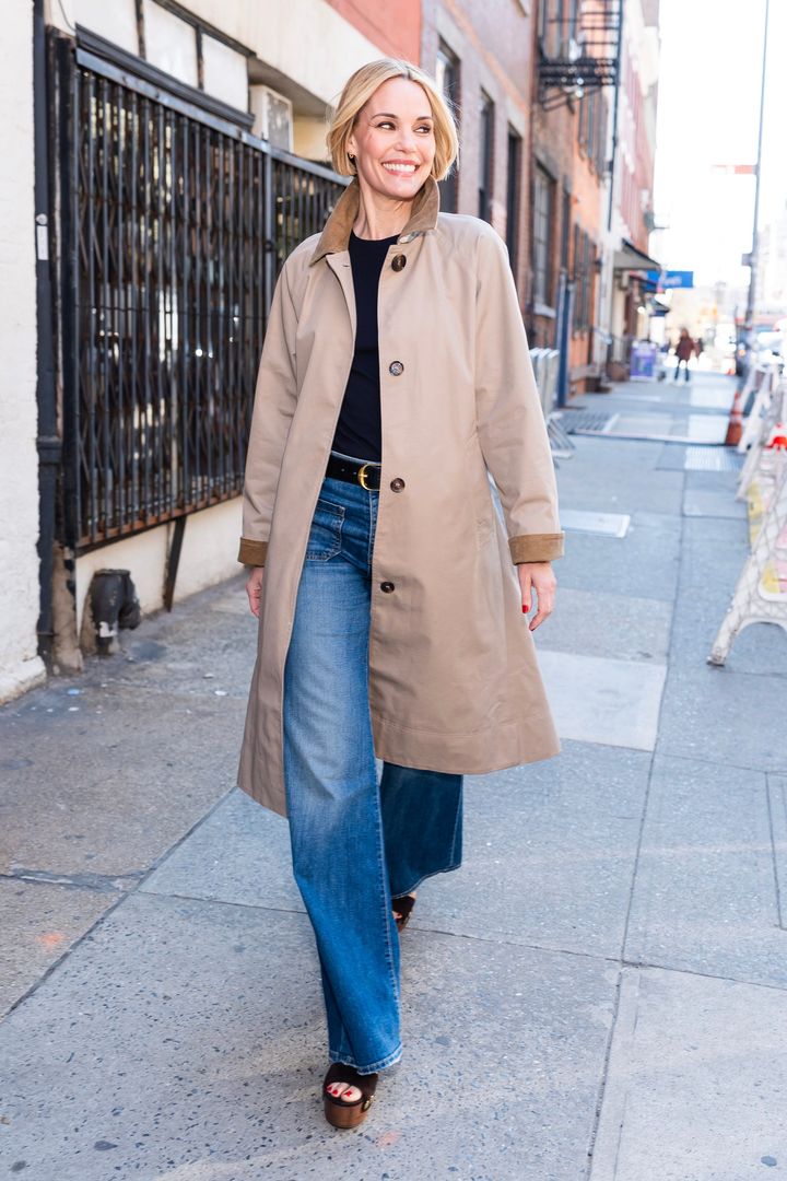 俳優のレスリー・ビブは、ニリ・ロタン(NILI LOTAN)のスマート・ジーンズをチョイス。そこにジャンヴィト・ロッシ(GIANVITO ROSSI)のプラットフォームサンダルにシンプルな黒Tシャツ、そしてクラシックなトレンチコートを合わせ、ミニマムでシックな着こなしを完成させた。