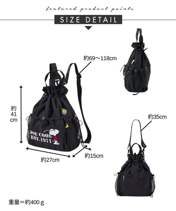 A4のファイルもすっぽり入る「10ポケットドロストデザイン2WAYリュックサック」(5489円)は、リュックとしてもショルダーとしても持てる優れもの。トレンド感のあるドロスト仕様を生かしたユニークなアイテムだ。ポケットは内側に6個、外側に4個。カラーはジョー・クールのデザインが映える黒、黒メッシュがアクセントになったベージュ×黒の2タイプ。