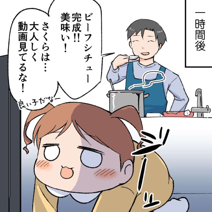1時間後、ビーフシチューが完成。普段料理をしないわりに、我ながらうまくできたのではないでしょうか。さくらを見ると相変わらず動画に夢中。動画を見せておくだけでこんなにも大人しくしてくれるなんて、さくらは本当に手のかからない良い子です。