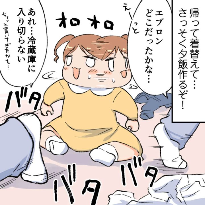 帰宅して着替えて、さっそく調理開始。脱いだ服はひとまず床に置いて、食材は傷まないうちに冷蔵庫へ。しかし、思った以上に買いすぎたのか、冷蔵庫はぎゅうぎゅうでなかなか収まりません。バタバタと動き回っていると、その様子につられたのか、さくらまで一緒にオロオロし始めます。